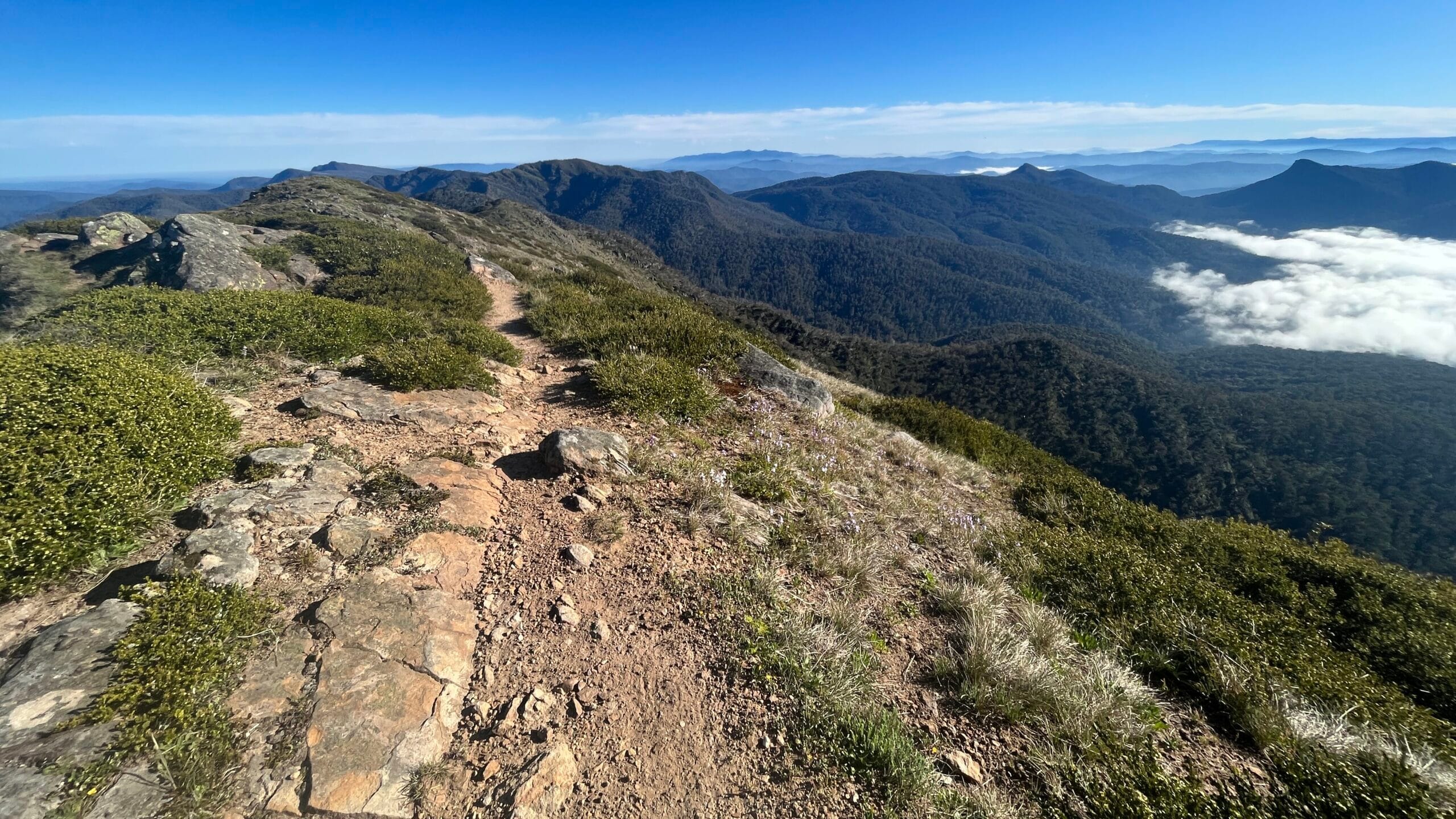 I found multiple turnoff points marked with pink ribbons on Zeka Spur Track, but the turnoff I ended up using was not marked at all, so YMMV here. If you are returning via Old Zeka Track, then good luck. Upon plunging into a questionable divot in the scrub, you may occasionally realise you’re on a human-made track (as opposed to a sambar track) by the presence of rocks underfoot. I presume they have been placed there to prevent trees from growing over the track. An attempt was made.