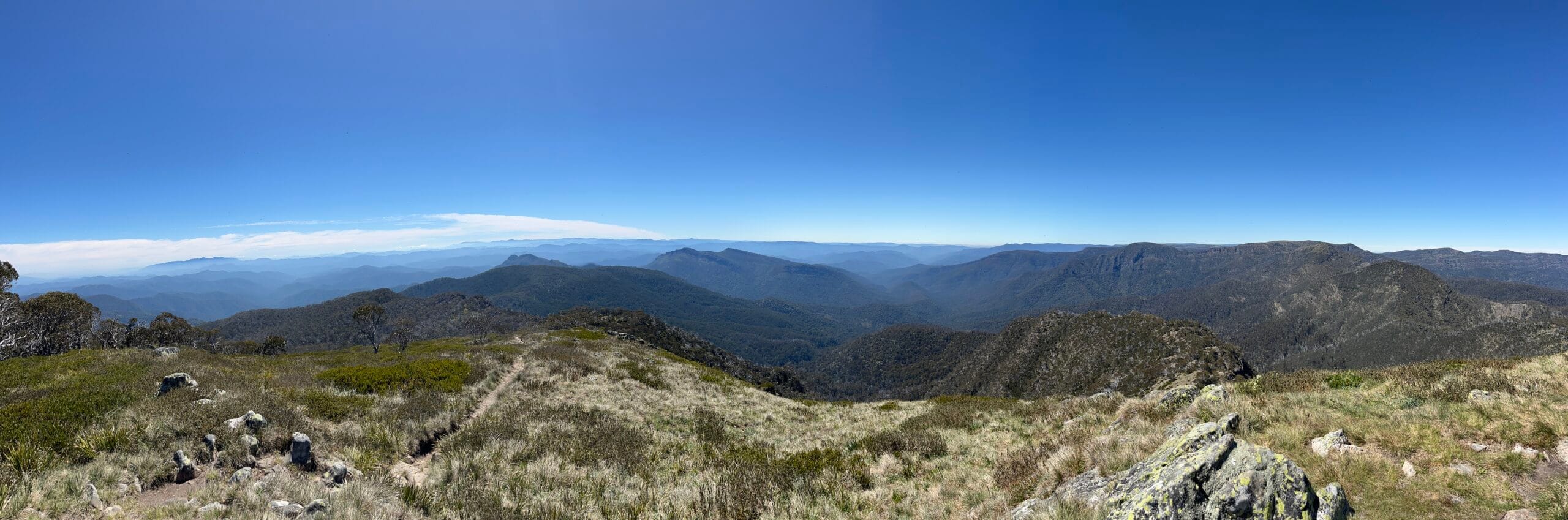 Scrambling along a rocky ledge and through thick correa while trying to stay on course was really tough going and we were pretty bashed up by the time we got through. 1.5km/h kinda stuff. We found the trail again and figured we were now set for a cruisy downhill into Viking Saddle. Wrong. There’s a stretch of about 300m that is littered with fallen trees (probably the result of the storm with the massive winds; was it 2020?). It was really slow and hard work climbing over/under/around the trees and, again, we spent many more tickets and drank much more water than we had planned to.