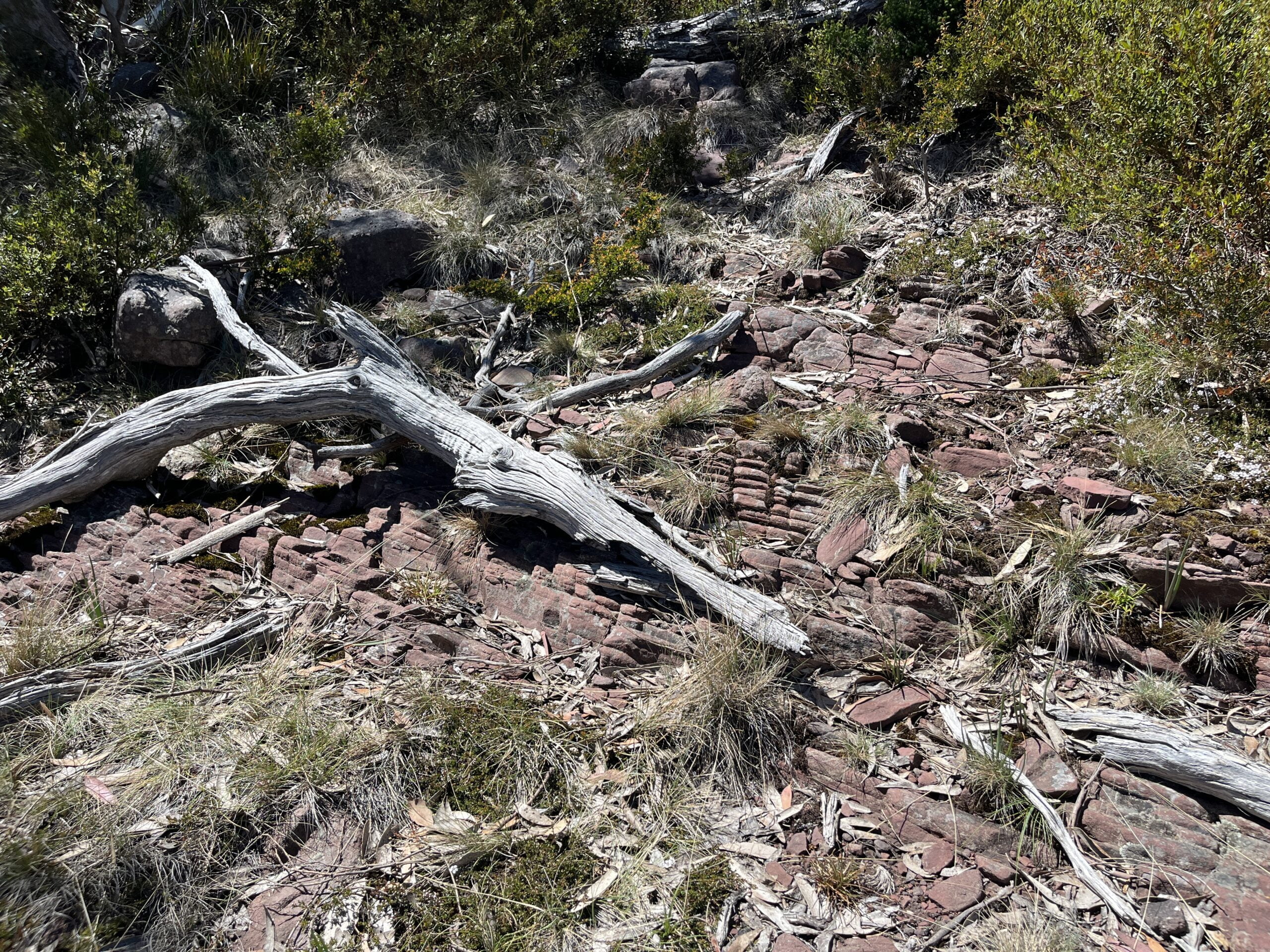 Unlike many other boulder fields, it eventually becomes possible to identify a footpad across red beds because red shale wants to disintegrate into a chalk outline for your corpse.