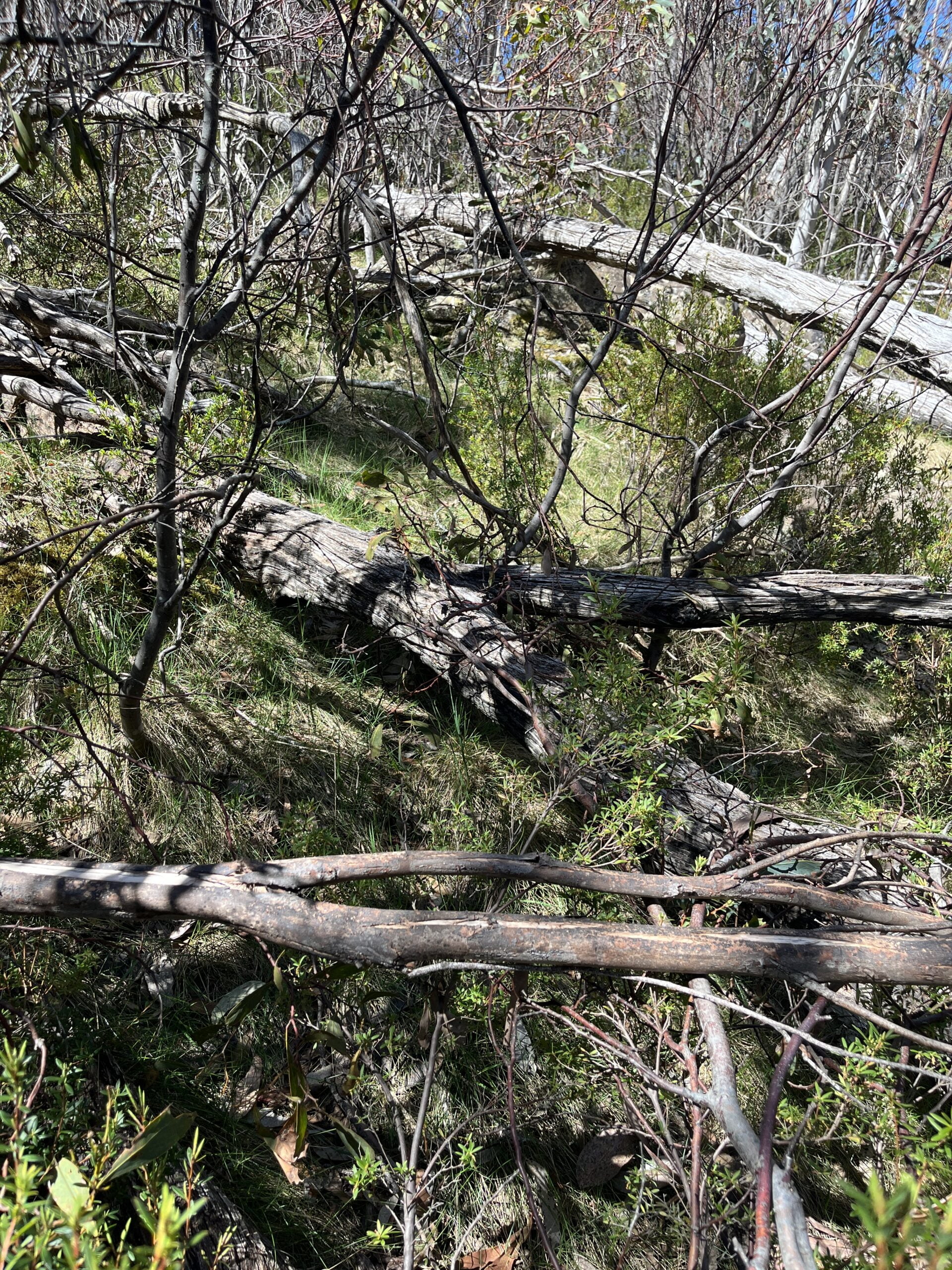 - My tolerance for being ‘lost’ was completely blown out. For the two hours I spent stumbling around scared and confused, I was never very far from the track intersection. I knew I was approximately where I was meant to be, and my false confidence was bolstered by the fact I could see my position on a GPS device. It gave me the sense that the track would/could be just over/around the next tree. But all the trees — fallen or upright — were as tall as (if not taller than) me, so that information didn’t mean much in terms of putting one foot in front of the other. It meant even less as I got progressively more shaky and delirious. Getting over an obstacle was impossibly dangerous. Getting around meant I risked getting even further from the track. Even in the sections where I could, with great effort, push through, it exacerbated my fatigue, drained all the energy I had left, and inevitably led me to another huge obstacle anyway.