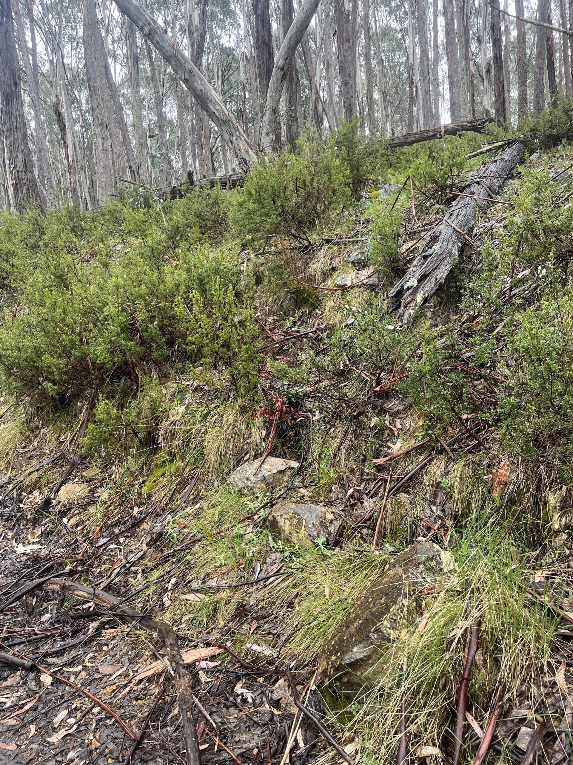 Turning on my torch was a bit like driving through fog and drizzle with high beams on, i.e., not really that helpful. Nonetheless, the torch beam created a kind of mental ‘tunnel vision’, forcing me to focus on the section of impenetrable scramble immediately in front of me, rather than being overwhelmed by the equally impenetrable scramble everywhere else. I set a bearing, ploughed through/over every single thing in my way, and somehow made it those last 200m back onto the Mount Howitt Walking Track.